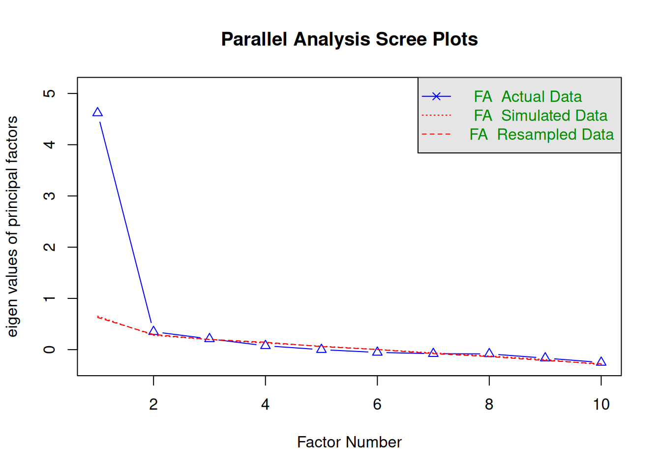 Die «factor number» über der 1-Linie («Eigen values» > 1) ist eine Empfehlung für die Anzahl an Faktoren, bei denen jeder Faktor mehr Varianz (Eigenwert > 1) auf sich vereint als die ursprünglichen Dimensionen.